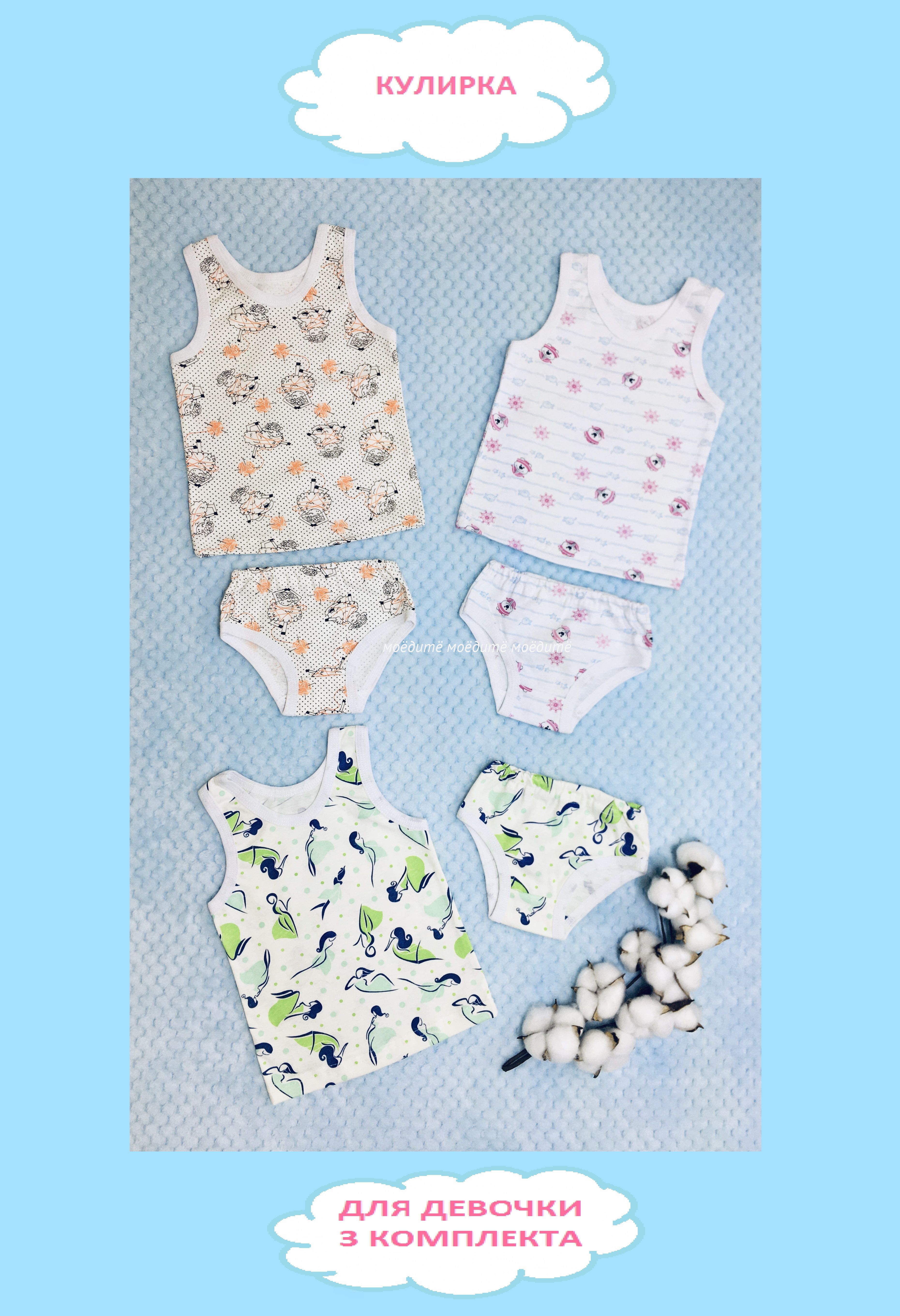 В упаковке 3 комплекта одного размера, разной расцветки. В комплект для девочек входит маечка и трусики.
