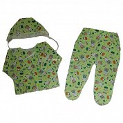 Комплект состоит из распашонки с рукавчиками трансформерами и с кнопочкой на одной стороне, ползунков на резинке, чепчика. Все швы у набора выполнены наружу. Рисунки в каждой партии отличаются.