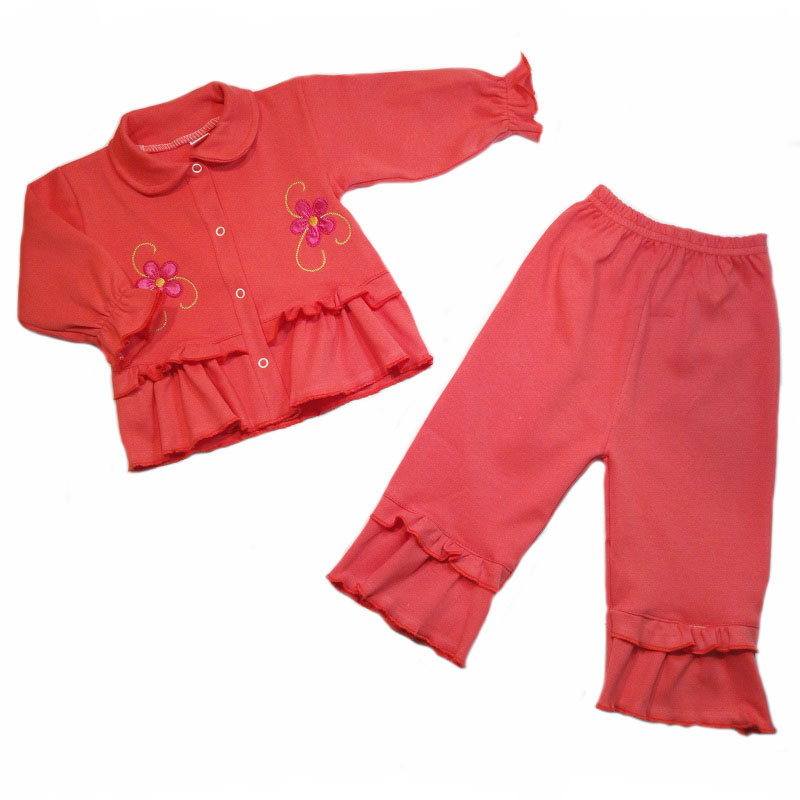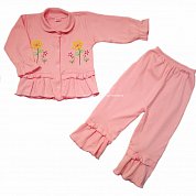 Костюм состоит из кофточки с воротничком, с длинным рукавом на конце на резиночке, спереди на кнопочках, украшена вышивкой на обеих полочках, снизу с рюшкой, и штанишек на резинке, снизу украшены рюшкой.